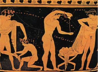 Επίσης σώζονται αρχαιολογικά ευρήματα που απεικονίζουν ανάλογες θεραπείες, όπως μαρτυρεί η απεικόνιση αττικού ερυθρόμορφου αγγείου που παριστάνει τον αθλητή Ιπποδέμοντα να δέχεται μαλάξεις στα πόδια από το δούλο Τρανίωνα.Το συγκεκριμένο ερυθρόμoρφo αγγείο, xρovoλoγεiται περί τo 510 π.X.