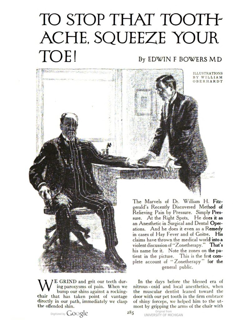 1915: Ο Δρ Bowers έγραψε ένα άρθρο που ονομάζεται “Για να σταματήσει αυτός ο πονόδοντος, πιέστε το δάχτυλό σας”. Δημοσιεύθηκε στο περιοδικό Everybody’s.